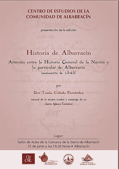 El Centro de Estudios de la Comunidad de Albarracín (CECAL) se complace en invitarles al acto de presentación del libro «Historia de Albarracín: Armonía entre la Historia General de la Nación y la particular de Albarracín (Manuscrito en 1948)» de D. Tomás Collado Fernández.