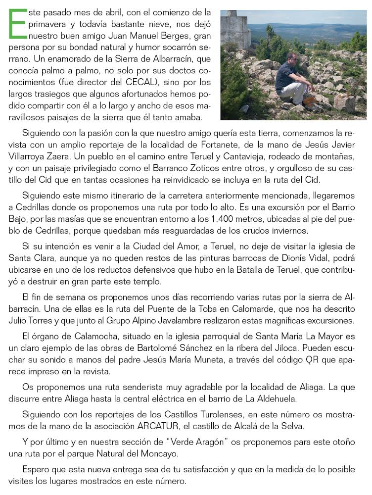 Verde Teruel, la revista turolense de naturaleza, rutas, patrimonio y turismo activo editada por Dobleuve Comunicación, S.L. rememora en el editorial de su última entrega de Agosto 2018 la figura de Juan Manuel Berges.