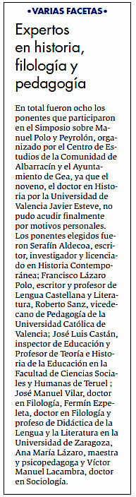 Esta localidad, Gea, acogió ayer un Simposio sobre Manuel Polo y Peyrolón, escritor y parlamentario de cuya muerte se cumplen 100 años y con raíces en Gea, de donde procedía su familia materna. Ocho profesores, investigadores, historiadores y filólogos comparecieron en una maratoniana jornada en la que, a través de ponencias y comunicaciones, se profundizó en los diferentes aspectos de la vida y obra de Peyrolón.