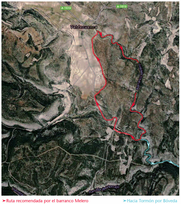 Otra  opción muy  recomendable, que  necesita una  mayor  preparación porque triplica la distancia y el tiempo en recorrerla, es girar a la izquierda en el corral de Juan Marco siguiendo el itinerario  del barranco de Valdecuenca hacia Bóveda en dirección  a Tormón  pasando por  Cerro  Mancho y Las Olivanas.  Es la senda  que  discurre  por  el cauce  del río Ebrón cuyo  nacimiento se localiza, según algunos autores, en el barranco de Valdecuenca.