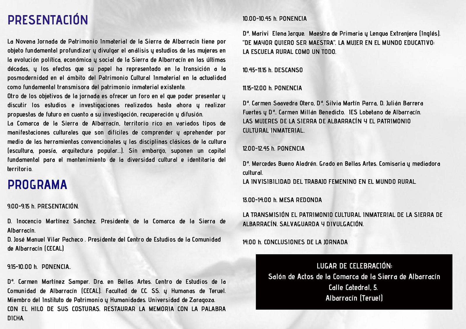 El día 23 de Noviembre de 2019 tendrán lugar las IX Jornadas de Patrimonio Cultural Inmaterial de la Sierra de Albarracín (PCISA) en el Salón de actos de la Comarca de la Sierra de Albarracín sita en la calle Catedral, 5 de Albarracín. Este año las jornadas versarán monográficamente sobre el papel de la mujer en la Sierra de Albarracín.