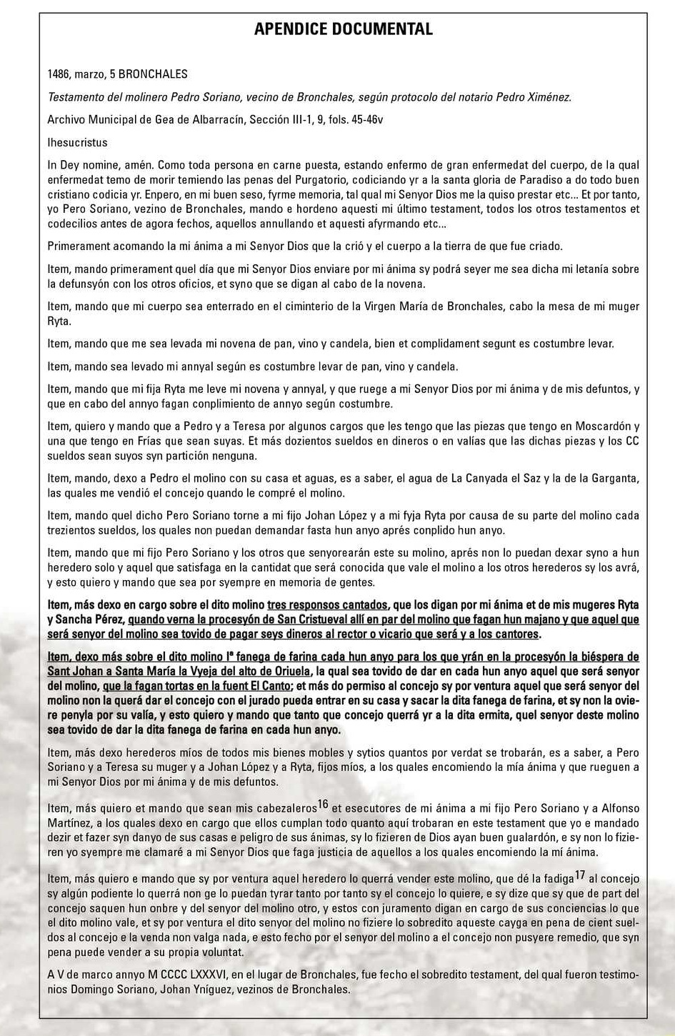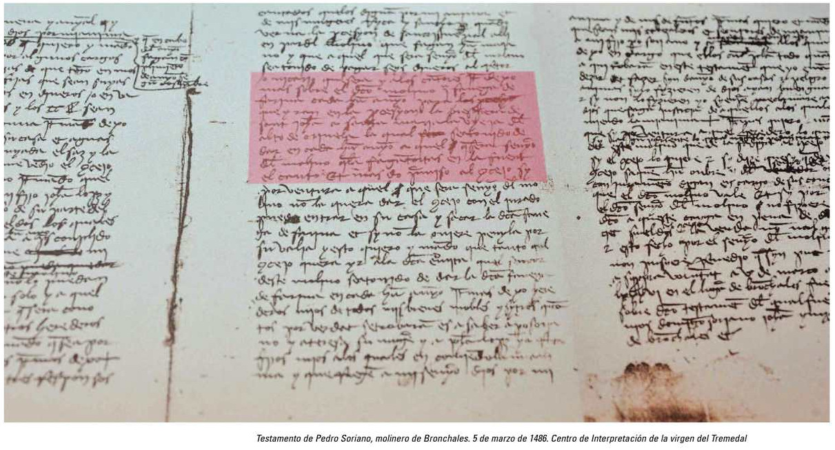 Este testamento aporta otras noticias interesantes sobre la religiosidad en Bronchales, pues Pedro Soriano ordena además que se haga un majano frente a su molino para que se le canten tres responsos a sus dos esposas fallecidas a la vuelta de la procesión de San Cristóbal: