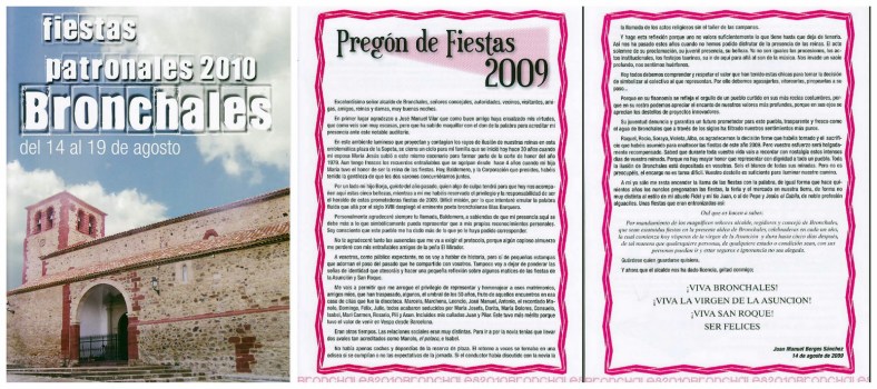 Reproducimos a continuación el pregón de fiestas patronales de Bronchales pronunciado el 14 de Agosto de 2009 por Juan Manuel Berges y publicado en el Programa de fiestas de 2010.