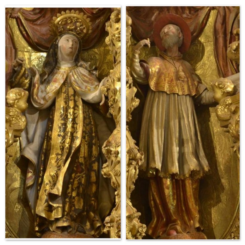 Siguiendo con las imágenes del retablo y enlazando con el espíritu de la Contrarreforma no nos puede extrañar que en las calles laterales aparezcan dos figuras importantísimas en la labor de defender la doctrina y de reformar desde dentro a la propia Iglesia. Son dos de los pesos pesados de la Iglesia Católica y por lo tanto debían ser el ejemplo en el que los predicadores harían especial énfasis. Así a la izquierda aparece Santa Teresa de Jesús (puede causar cierta extrañeza por ser precisamente reformadora del Carmelo, aunque ya han pasado bastantes años desde los conflictos entre descalzos y calzados) y San Carlos Borromeo pieza fundamental en la reforma de la Curia Romana. Ambos doctores de la Iglesia y con gran prestigio intelectual y moral.