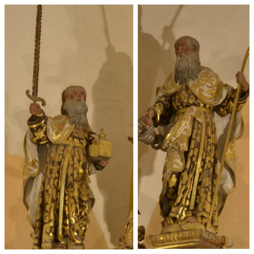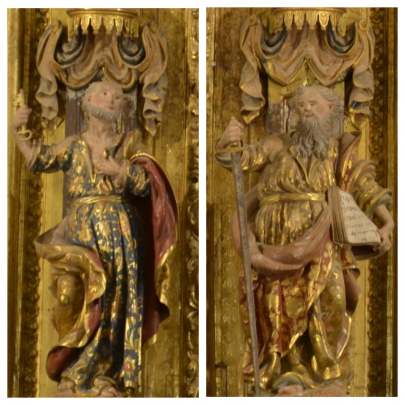 Así, es lógico presumir que las imágenes que acompañaban a San José deben de hacer hincapié en las principales doctrinas que los fieles de aquel tiempo debían conocer. A los dos lados de la hornacina central aparecerán los dos apóstoles que son las columnas sobre las que se funda la Iglesia de Cristo, colocados sosteniendo todo el entramado central: San Pedro a la izquierda y San Pablo a la derecha.