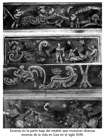 Aunque no tengan relación con la simbología religiosa del retablo hay en la parte inferior del retablo una serie de cuadros de pequeño tamaño. Son escenas de la vida cotidiana, sin connotación religiosa y que pasan desapercibidas para muchos de los que contemplan la magnificencia del resto del retablo, pero que creo que merece la pena destacar. Esta costumbre era corriente en aquellos tiempos en la decoración de los retablos. Son escenas de un gran valor informativo ya que reflejan de una manera deliciosa la vida y costumbres de Gea en el siglo XVIII. Seguramente serían añadidas por algún fraile con vocación artístico y son un verdadero cuadro costumbrista. En las imágenes aparecen, por ejemplo, dos escenas de una riña entre un hombre y una mujer y otra de una discusión entre dos hombres.