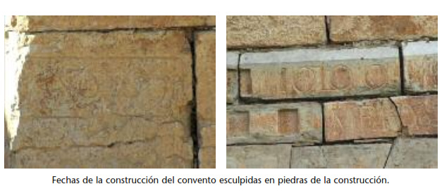 En uno de los bloques que se puede ver en una esquina del convento, en la pared norte y en su parte baja aparece la fecha de 1691, por lo que debemos pensar que en esa fecha se estaban empezando a levantar los muros de la iglesia. Además en una antigua puerta que daría a la huerta, orientada al oeste, hay, en un dintel, otra fecha “16100” (observamos la curiosa forma de escribir 1700) que sugeriría que la parte baja el convento ya estaría levantada.