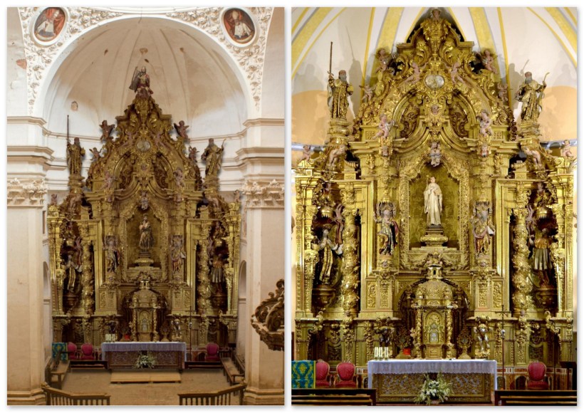 Reconstrucción por ordenador de la primitiva situación del retablo en el convento (izda.) y el restaurado re-ubicado en la iglesia de San Bernardo (dcha.)*