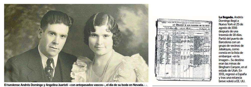 Al llegar a Utah, Andrés Domingo se estableció como minero en Bingham Canyon al igual que un nutrido grupo de emigrantes de Jabaloyas. Posteriormente, se trasladó a Nevada para trabajar en una compañía eléctrica y formó una familia con su esposa, Angelina Juaristi, descendiente de emigrantes vascos. La única referencia que dio a sus familiares estadounidenses sobre su procedencia era que había nacido «<en la provincia de Teruel, sin más detalles», como recuerda Linda.
