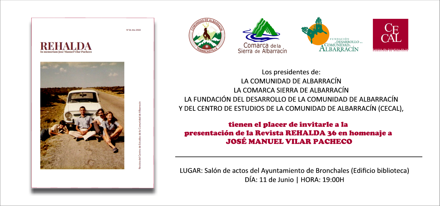 Tenemos el placer de invitarles a la presentación de la revista Rehalda nº. 36, edición especial dedicada a José Manuel Vilar Pacheco In Memoriam. El acto tendrá lugar el día 11 de Junio de 2022 a las 19.00 h en el salón de actos del Ayuntamiento de Bronchales (Edificio Biblioteca).