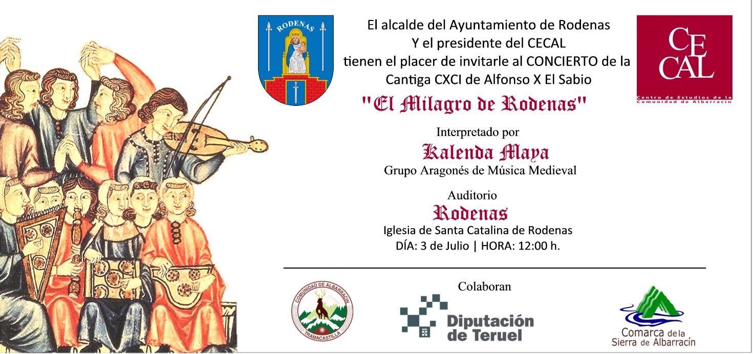 El alcalde del Ayuntamiento de Rodenas y el presidente del CECAL tienen el placer de invitarle al CONCIERTO de la Cantiga CXCI de Alfonso X El Sabio «El Milagro de Rodenas» interpretada por Grupo Aragonés de Música Medieval «Kalenda Maya». … Continuar leyendo Invitación al concierto de música medieval «El milagro de Rodenas»