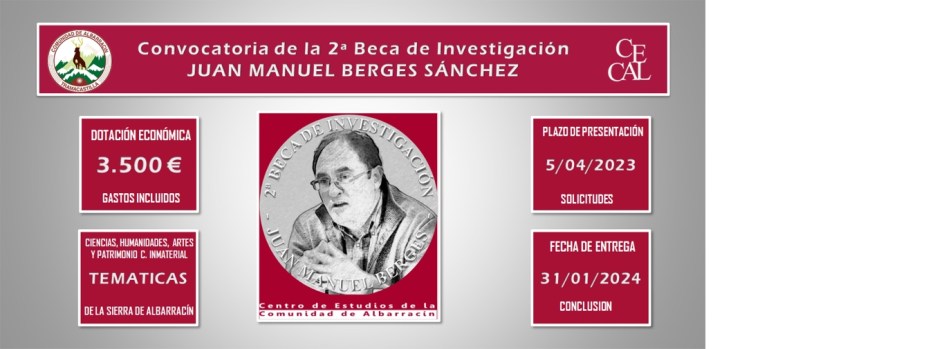 El Centro de Estudios de la Comunidad de Albarracín (CECAL), en colaboración con la Comunidad de Albarracín convoca la 2ª Beca de Investigación “Juan Manuel Berges Sánchez”.