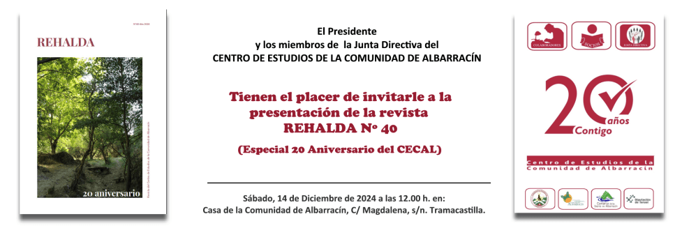 El presidente y la Junta Directiva del CECAL tienen el placer de invitarles a la presentación de la revista Rehalda nº 40 que tendrá lugar en la Casa de la Comunidad de Tramacastilla el sábado 14 de Diciembre de 2024 a las 12.00 h de la mañana. A la finalización del evento, celebraremos nuestro 20 aniversario con un vino español.