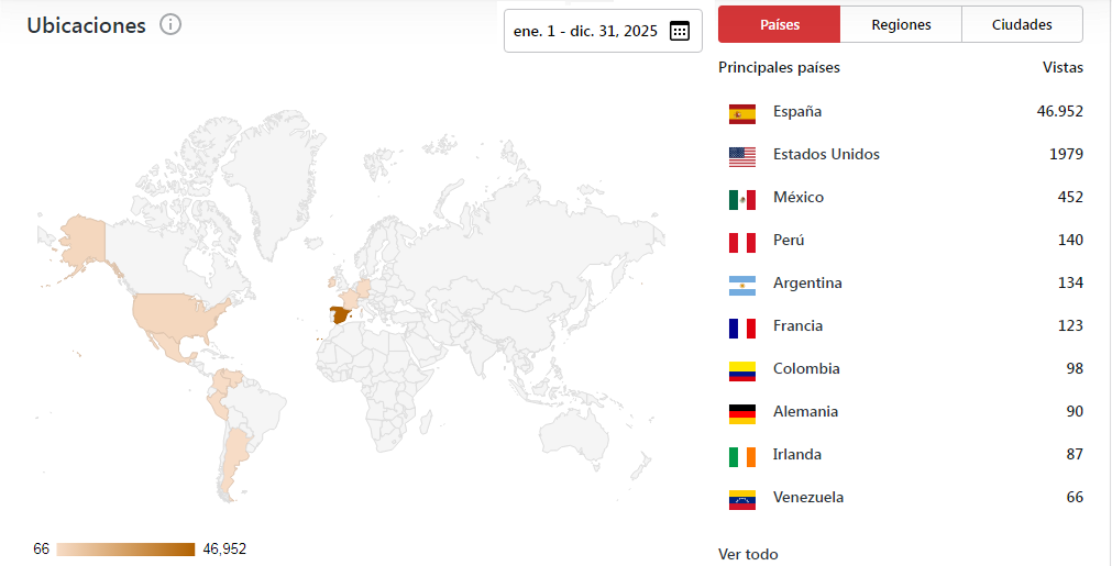 - En total son 73 países que han visitado la Web en 2025. El 90% de los visitantes son de España como es de esperar. A este se unen numerosos países hispanohablantes que representan el 4% de las visitas.